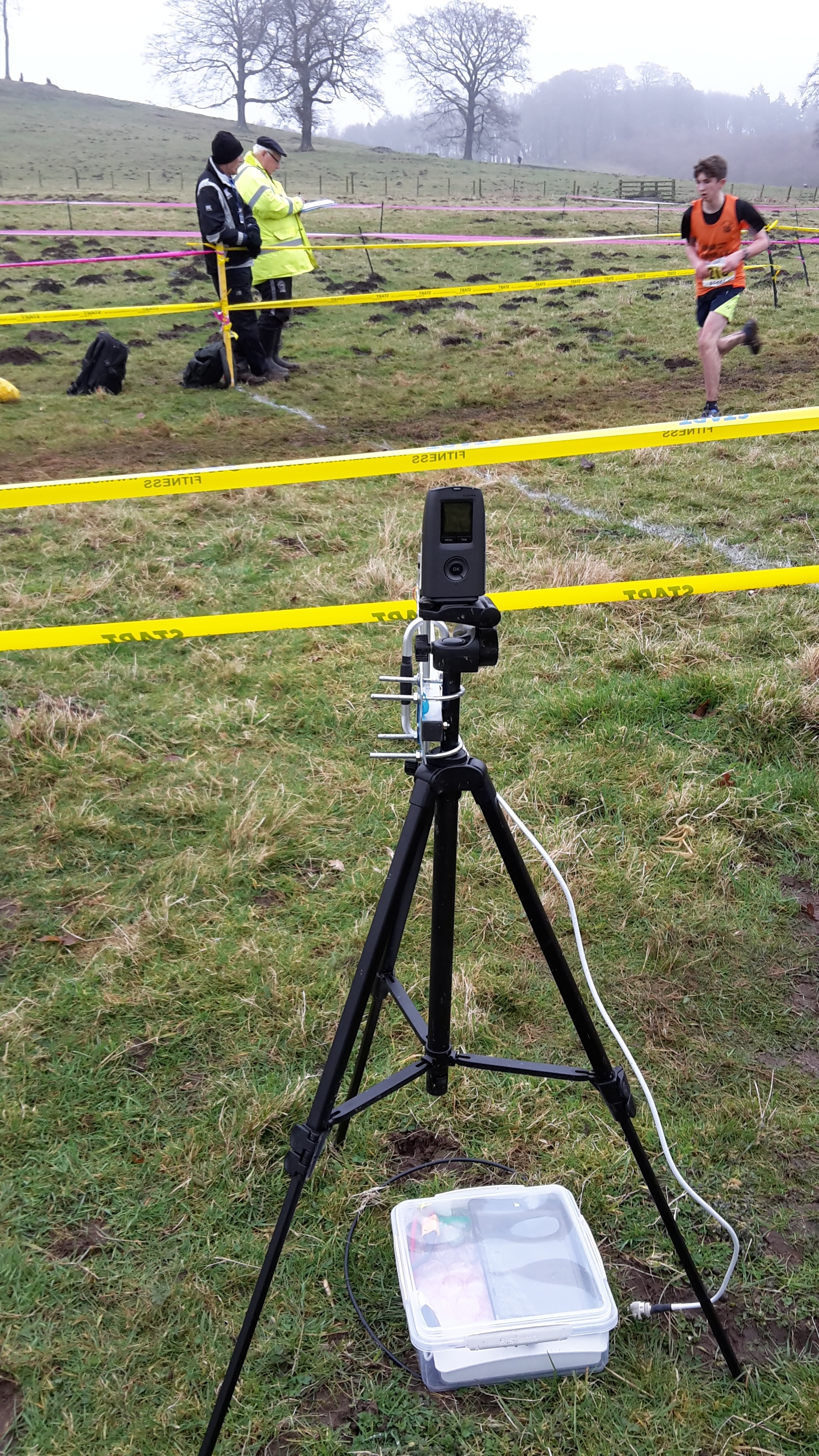 For the cross country I set up 3 of these, one on the finish line as shown here, with a slightly larger antenna, and 2 in a short finish funnel.