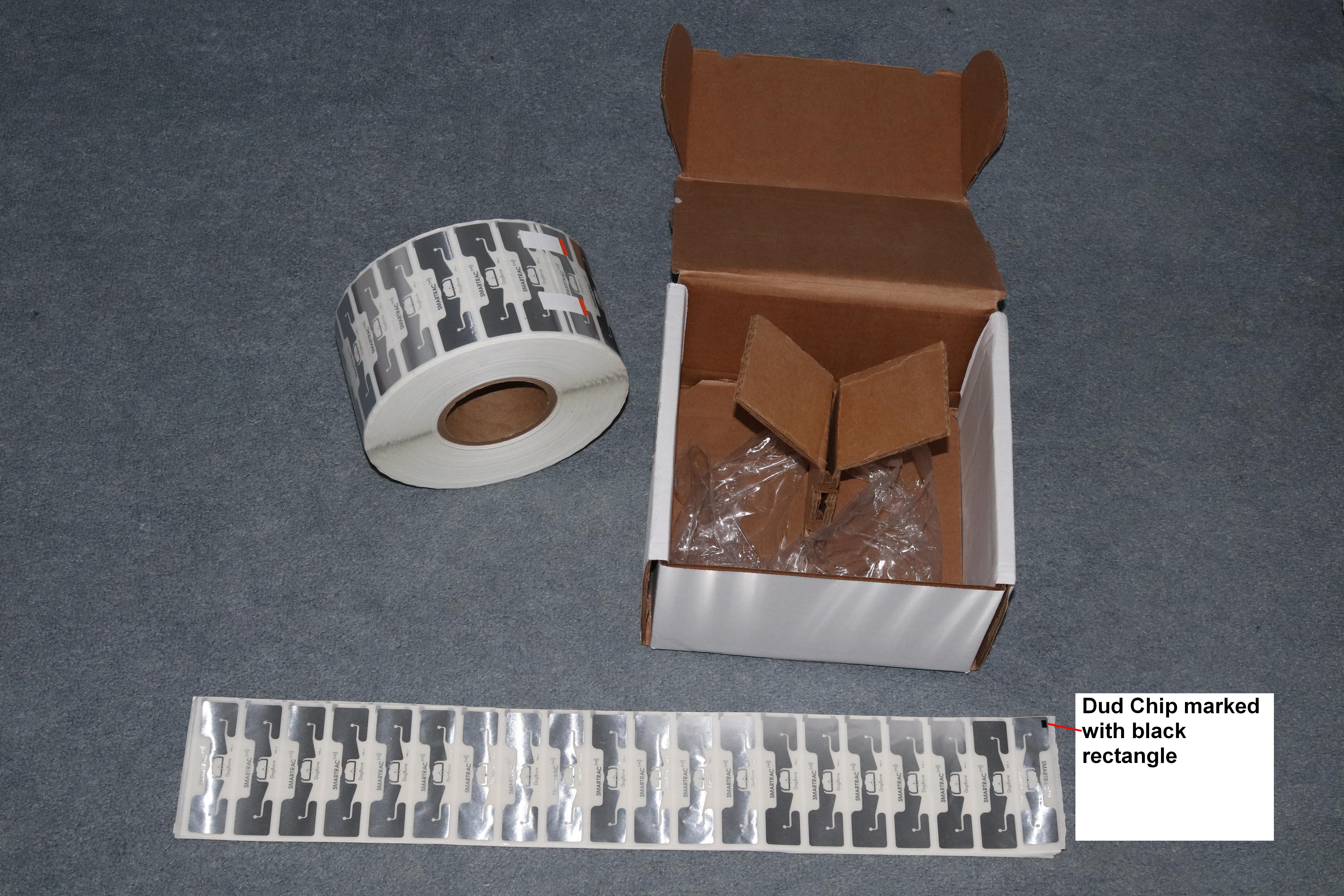 The RFID tags for these systems are made by the million and are very cheap. If you buy a full reel of 5000 chips, which is the basic minimum order quantity, they cost around £600 which is around £0.12 per tag so they can be treated as disposable, just as bibs are. A very common tag used in race timing is the Smartrac Dogbone tag and, after testing a few different tags I found them to be the best so that's what is described here.
